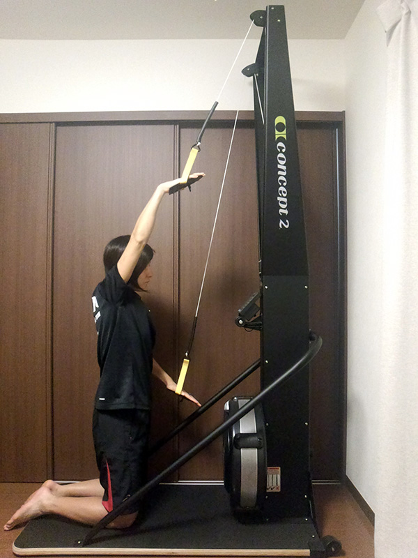 スイムエルゴを引き、ハンドルを加速させるために体重を使うことにより、腕・肩・体幹・足で下方向のクランチが実行されます。